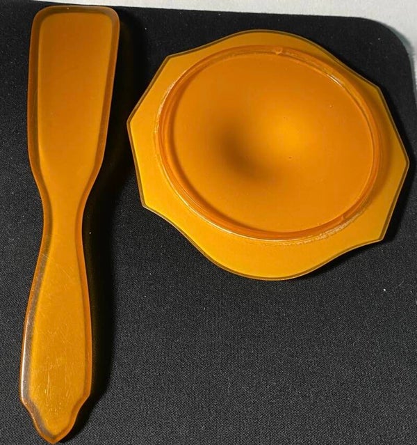 "Vintage bakelit shoehorn and Jar cover","Celluloid vanity set pieces with gold trim
