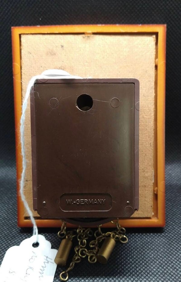 This miniature wind-up clock features a Hummel illustration printed by Ars Sacra, a German publisher known for religious and children's imagery. Produced in West Germany during the 1960s-1980s, it combines decorative art with functionality in a small wooden frame with hanging weights.