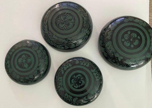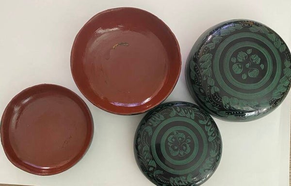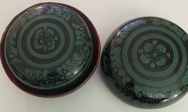 This collection features traditional lacquerware items from multiple cultures. The black and green pieces are Japanese lacquerware boxes with hand-carved floral designs from the mid-20th century.