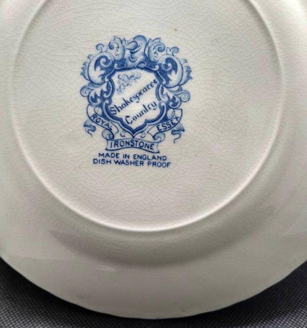 This commemorative blue and white transferware plate depicts the historic Globe Theatre, which was built in London in 1599 and is famously associated with William Shakespeare's plays.