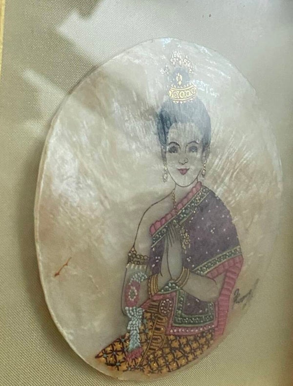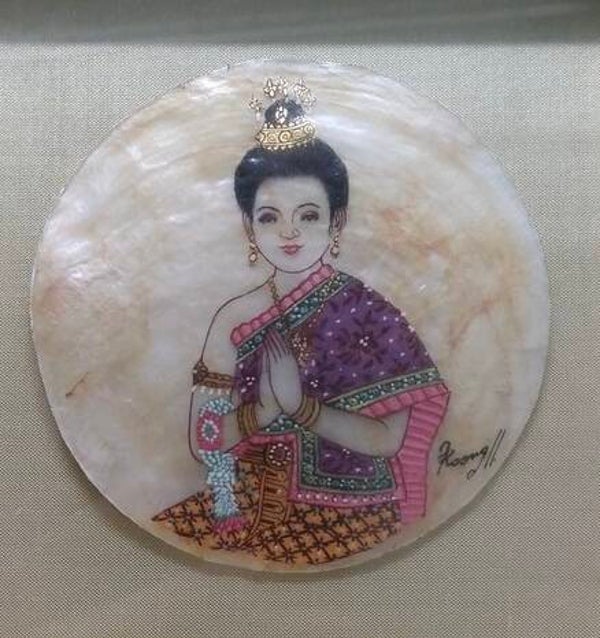 The painting is executed on a polished mother-of-pearl disc and framed in a simple gold-toned frame, representing a contemporary Thai handicraft tradition that dates from the late 20th to early 21st century.