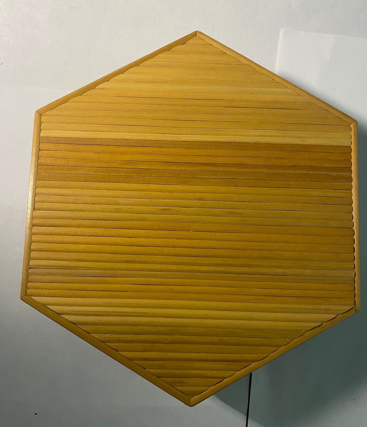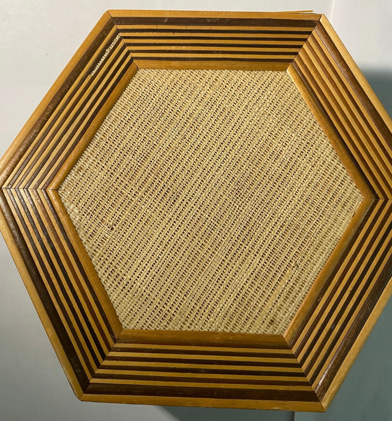 Collectors of vintage tropical decor and mid-century accessories value these pieces for their distinctive hexagonal shape, natural materials, and representation of the tiki and tropical aesthetic that was fashionable during that era.