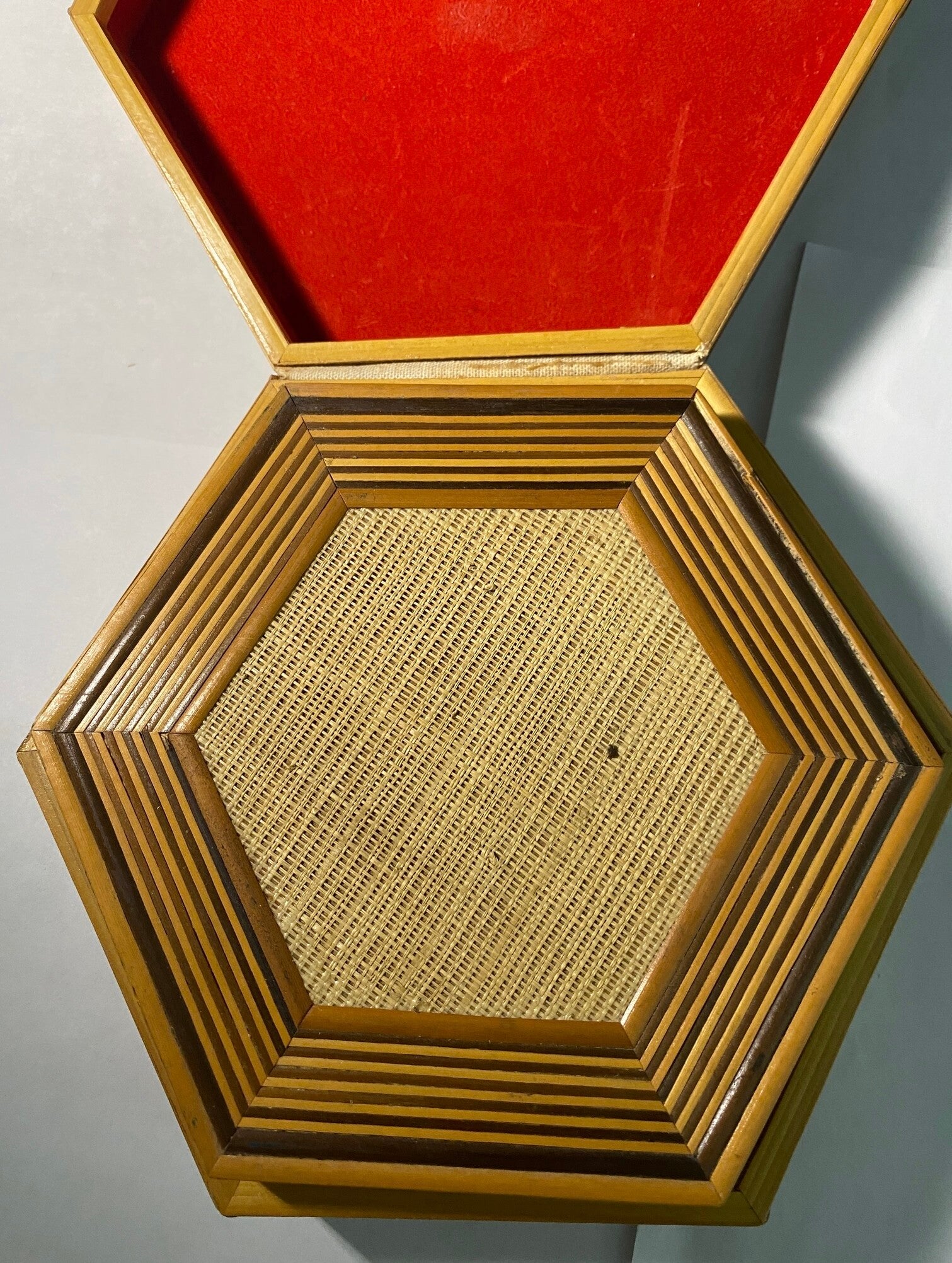 The combination of wood, woven rattan or bamboo, and red felt lining was typical of decorative boxes produced in Southeast Asia during this period.